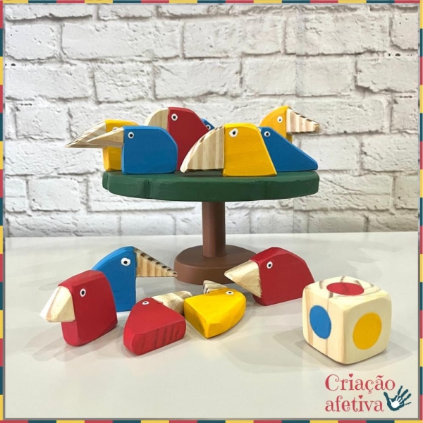O jogo inclui 1 copa, 1 tronco, 1 dado e 12 passarinhos produzidos em madeira pinus com pintura atóxica.